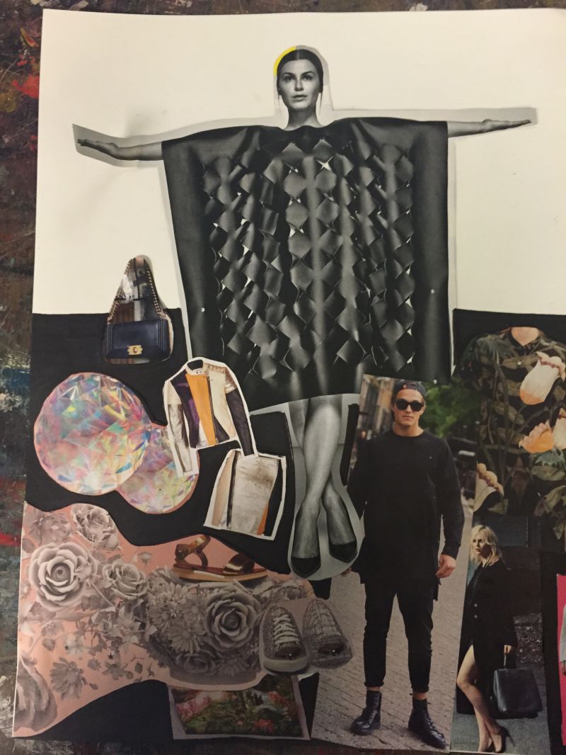 Dit is mijn collage. Ik heb hier verschillende elementen in verwerkt. Het zijn vooral voorwerpen die ik leuk vind. Je ziet hier bijvoorbeeld schoenen kleding en diamantjes. De bovenkant is wit omdat ik dit mooi vindt. En ik heb de onderkant zwart getekend met een zwarte marker.